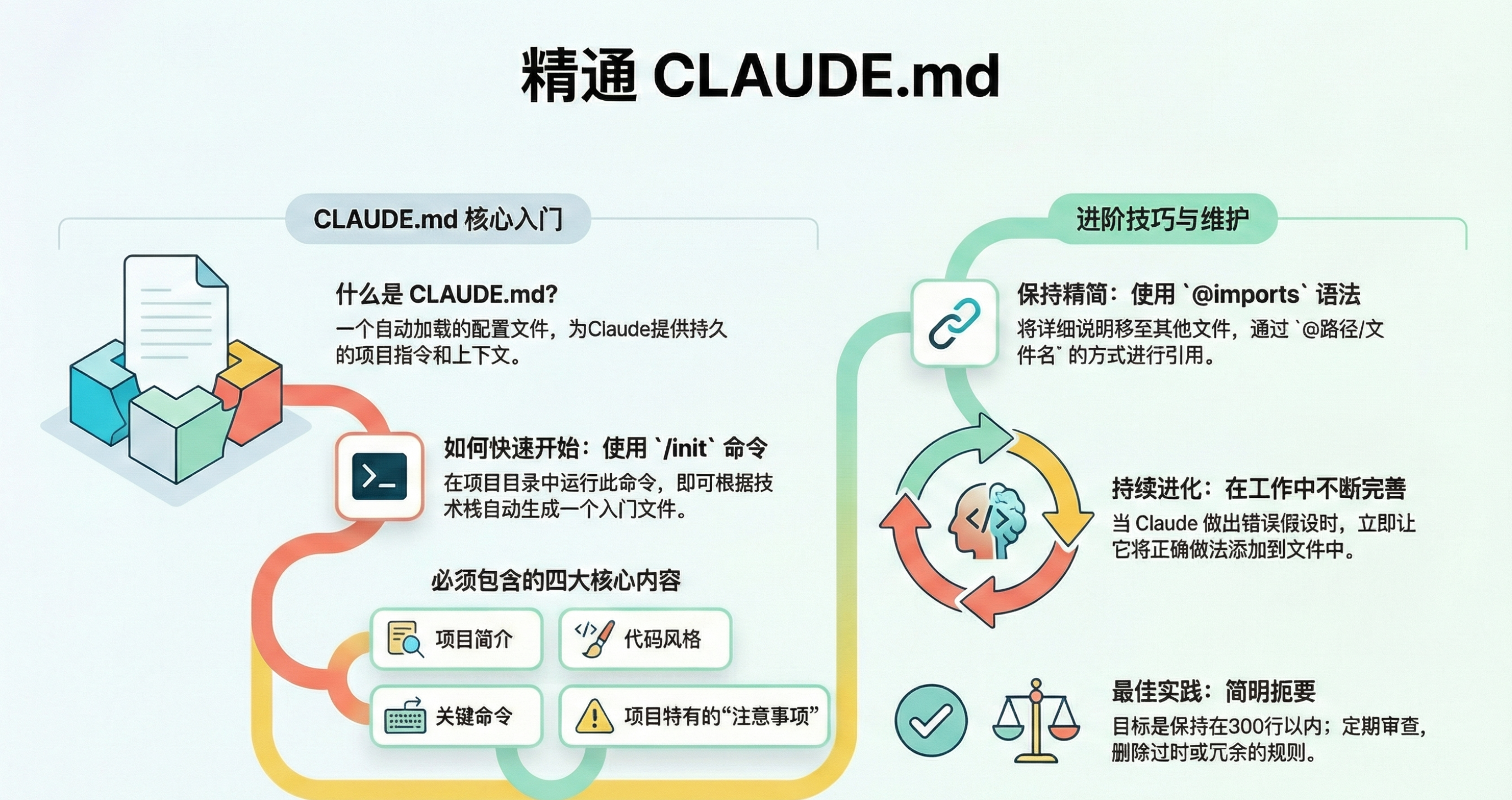 CLAUDE.md 远不止一个简单的配置文件。通过本文分享的五个高级技巧——将其视为活文档、保持精简、模块化管理、注意大小写,以及让 AI 自我优化——你可以将其从一个静态的指令列表,转变为一个强大的、与项目共同成长的动态知识库。